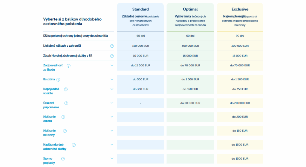 Ak niekto plánuje časté alebo najmä dlhšie cesty do zahraničia, balík Exclusive ponúka najkomplexnejšie krytie. Pre jednorazové alebo menej časté cesty môžu stačiť balíky Standard alebo Optimal.