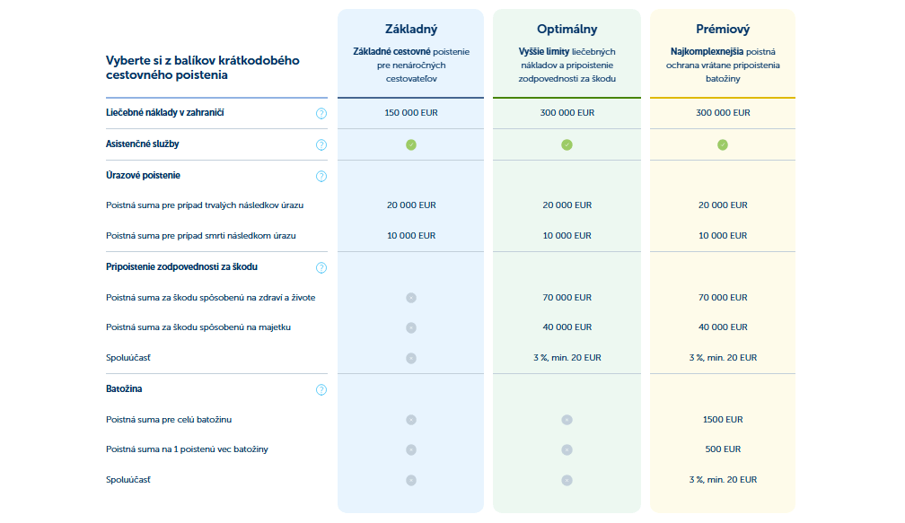 | Vysoké limity krytia – až 300 000 € pri krátkodobom poistení, až 500 000 € pri poistení ku karte. | Spoluúčasť 3 % (minimálne 20 €), čo môže byť nevýhodné pri menších škodách. |