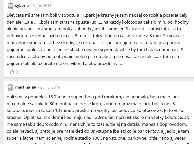 Medzi najčastejšie výhrady patria dlhšie čakacie doby na atrakcie počas víkendov alebo prázdnin. Napriek tomu väčšina recenzií hodnotí návštevu ako výborný zážitok, ktorý stojí za to absolvovať najmä v pracovné dni alebo mimo hlavnej sezóny.